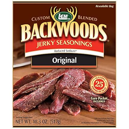 LEM Products Backwoods Reduced Sodium Original Jerky Seasoning, Ideal for Wild Game and Domestic Meat, Seasons Up to 25 Pounds of Meat, 18.3 Ounce Packet with Pre-Measured Cure Packet Included
